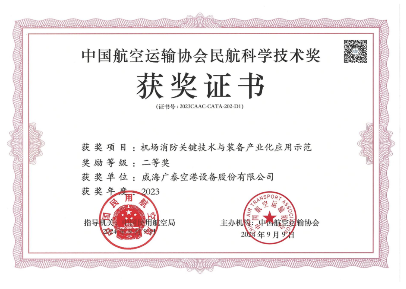 2024年10月25日,民航局第二屆CATA大會在北京召開,會議期間舉行了2022年度和2023年度中國航空運輸協會民航科學技術獎頒獎。威海廣泰“機場消防關鍵技術與裝備產業化應用示范”和“智能萬向傳輸航空貨運裝載設備關鍵技術開發與應用”項目分別榮獲“2023年度中國航空運輸協會民航科學…
