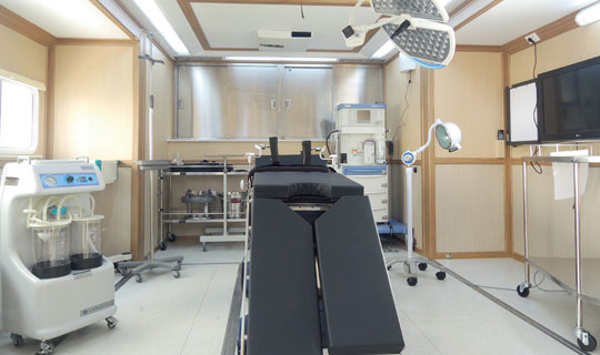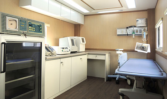 廣泰手術車通過層流凈化裝置達到艙內環境萬級凈化標準,整車集成供氧、制氧系統,安裝手術床、無影燈及其他手術專用儀器設備,在應急情況下實施手術救援。
